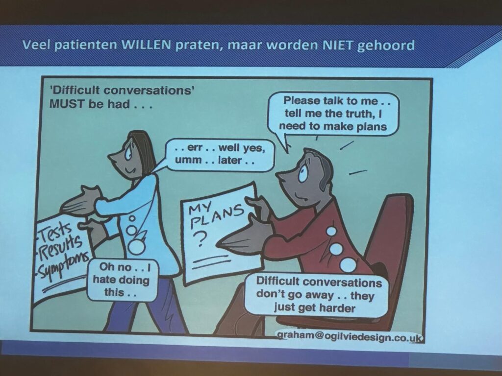 Marleen Oomes – Verpleegkundig Specialist Palliatieve Zorg, Expertisecentrum Palliatieve Zorg (LUMC) en Lijdi Hoogenboom- van Os – Verpleegkundig Consulent Team Ondersteunende en Palliatieve Zorg (GHZ) vertelden ons meer over waar het om gaat bij pro-actieve zorgplanning: ga het gesprek aan met de patiënt over wensen en manier van leven. Maak moeilijke onderwerpen bespreekbaar en haal de olifant uit de kamer. Marleen: “Het is belangrijk om te realiseren dat het niet alleen om het levenseinde gaat, maar ook over kwaliteit van leven. Het kan voor patiënten vaak een grote opluchting zijn om hierover te spreken, mits het gesprek op de goede manier wordt gevoerd. Het moet altijd gaan over wat de patiënt wil en aansluiten bij de wensen en behoeften van de patiënt.”