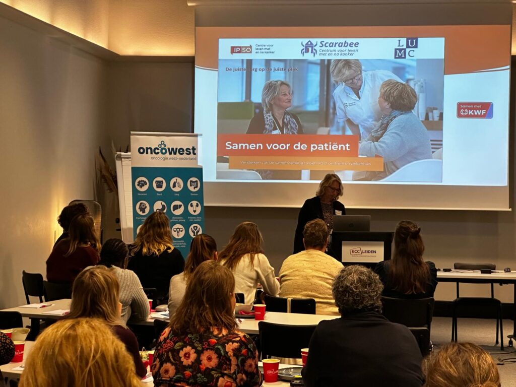 Nienke Kronemeijer – Coördinator Scarabee (LUMC) vertelde over wat Instellingen voor PsychoSociale Oncologie (IPSO) voor patiënten kunnen betekenen en hoe de samenwerking tussen de ziekenhuizen en IPSO-centra kan worden verbeterd. Er zijn inmiddels 28 centra in Nederland die kankerpatiënten een laagdrempelig ‘huiskamergevoel’ bieden. De uitnodiging staat dan ook open voor alle zorgverleners: loop eens binnen bij een IPSO-centrum om te zien hoe het eruitziet en om te bespreken hoe we de samenwerking in de regio verder kunnen verbeteren. Soms is het ook mogelijk dat vrijwilligers naar de afdeling komen voor een gesprek. Deze gesprekken blijken voor patiënten heel waardevol, omdat ze gaan over waar de patiënt over wil spreken: zijn ziekte, de behandeling, maar soms ook dagelijkse beslommeringen of de toekomst. Dit kan ook voor zorgverleners prettig zijn, omdat er tijd en aandacht kan worden gegeven die zorgverleners niet altijd kunnen geven.